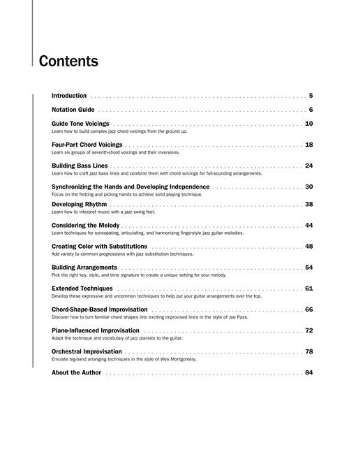 Aprenda a arte da guitarra jazz fingerstyle com estas 12 lições abrangentes. Com capítulos que visam a construção de vocabulário de acordes, separando baixo e vozes, melodia e improvisação, no estilo de grandes nomes da guitarra jazz como Wes Montgomery e Joe Pass. Um guia para a construção e reprodução de grandes arranjos de guitarra solo dos standards de jazz.