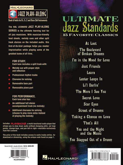 Esta série é uma excelente ferramenta de estudo para todos os músicos de Jazz. Todos os temas transcritos (melodia e acordes) para instrumentos em Bb, Eb, C e F. No CD cada tema tem duas gravações; uma faixa completa com a melodia e uma segunda faixa com o mesmo tema, porém sem a melodia, somente o play-back para que você possa tocar junto. Você ainda pode eliminar o Baixo ou o Piano usando o "balanço" do seu equipamento de som. "Chorus" adicionais para improvisação. Incluindo: At Last • The Boulevard of Broken Dreams • I'm in the Mood for Love • Just Friends • Laura • Lester Leaps In • Li'l Darlin' • The More I See You • Secret Love • Star Eyes • Street of Dreams • Taking a Chance on Love • That's All • You and the Night and the Music • You Stepped Out of a Dream.