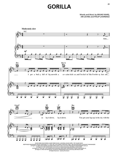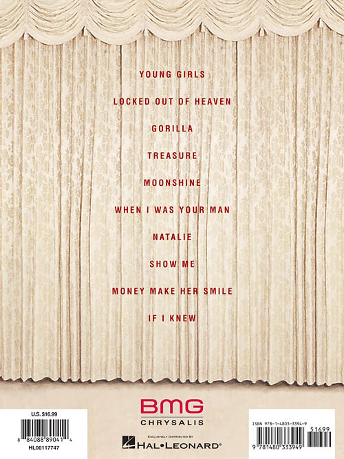 Hawaiian-born pop star Bruno Mars splashed onto the scene with his debut album Doo-Wops and Hooligans in 2010, and now is back and better than ever with this 2012 CD release. Our folio includes all ten “unorthodox” tunes from this album, including the lead single “Locked Out of Heaven”, plus: Gorilla • If I Knew • Money Make Her Smile • Moonshine • Natalie • Show Me • Treasure • When I Was Your Man • Young Girls.