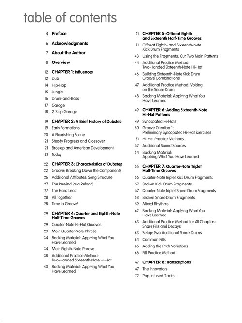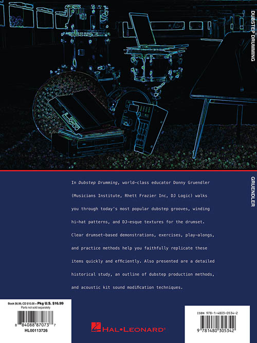 In Dubstep Drumming, world-class educator Donny Gruendler walks you through today's most popular dubstep grooves, winding hi-hat patterns, and DJ-esque textures for the drumset. Clear drumset-based demonstrations, exercises, play-alongs, and practice methods help you faithfully replicate these items quickly and efficiently. Also presented are a detailed historical study, an outline of dubstep production methods, and acoustic kit sound modification technique.