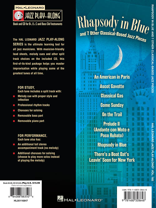 Esta série é uma excelente ferramenta de estudo para todos os músicos de Jazz. Todos os temas transcritos (melodia e acordes) para instrumentos em Bb, Eb, C e F. No CD cada tema tem duas gravações; uma faixa completa com a melodia e uma segunda faixa com o mesmo tema, porém sem a melodia, somente o play-back para que você possa tocar junto. Você ainda pode eliminar o Baixo ou o Piano usando o "balanço" do seu equipamento de som. "Chorus" adicionais para improvisação. Incluindo: An American in Paris • Ascot Gavotte • Classical Gas • Come Sunday • On the Trail • Prelude II (Andante Con Moto E Poco Rubato) • Rhapsody in Blue • There's a Boat Dat's Leavin' Soon for New York.