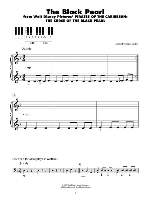 Arranjos facilitados para iniciantes no formato 5 finger (melodia dividida entre as mãos direita e esquerda) - The Black Pearl • Blood Ritual/Moonlight Serenade • Davy Jones Plays His Organ • He's a Pirate • Hoist the Colours • The Medallion Calls • One Day • Up Is Down.
