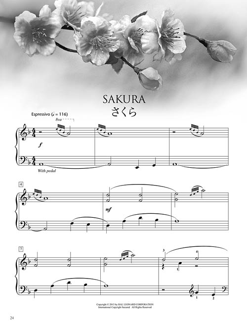 Arranjos para piano solo de nível intermediário de 24 músicas folclóricas tradicionais do Japão; incluindo: Blooming Flowers • Counting Game • The Fisherman's Song • Harvest Song • Itsuki Lullaby • Joyful Doll Festival • Kimigayo • Picking Tea Leaves • The Rabbit on the Moon • Sakura • Takeda Lullaby • Village Festival • Where Are You From? • e outras!!!