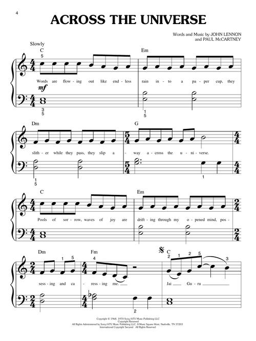 Arranjos facilitados para piano; All My Loving • And I Love Her • Come Together • Day Tripper • Eight Days a Week • Eleanor Rigby • The Fool on the Hill • Good Day Sunshine • Here Comes Comes the Sun • Hey Jude • I Will • Let It Be • Michelle • Ob-La-Di, Ob-La-Da • Penny Lane • Revolution • Something • Sgt. Pepper's Lonely Hearts Club Band • Twist and Shout • When I'm Sixty-Four • Yesterday • e outras!!!