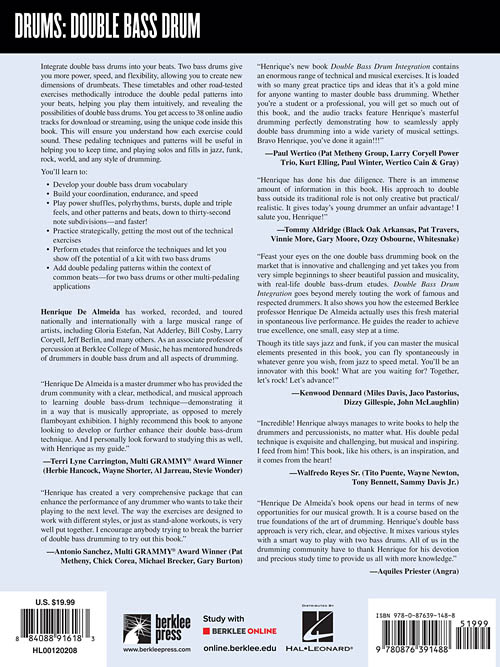 Integrate double bass drums into your beats. Two bass drums give you more power, speed, and flexibility, allowing you to create new dimensions of drumbeats. These timetables and other road-tested exercises methodically introduce the double pedal patterns into your beats, helping you play them intuitively, and revealing the possibilities of double bass drums. You get access to 38 online audio tracks for download or streaming, using the unique code inside this book. This will ensure you understand how each exercise could sound. These pedaling techniques and patterns will be useful in helping you to keep time, and playing solos and fills in jazz, funk, rock, world and any style of drumming.