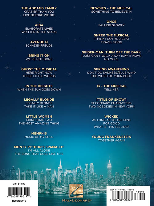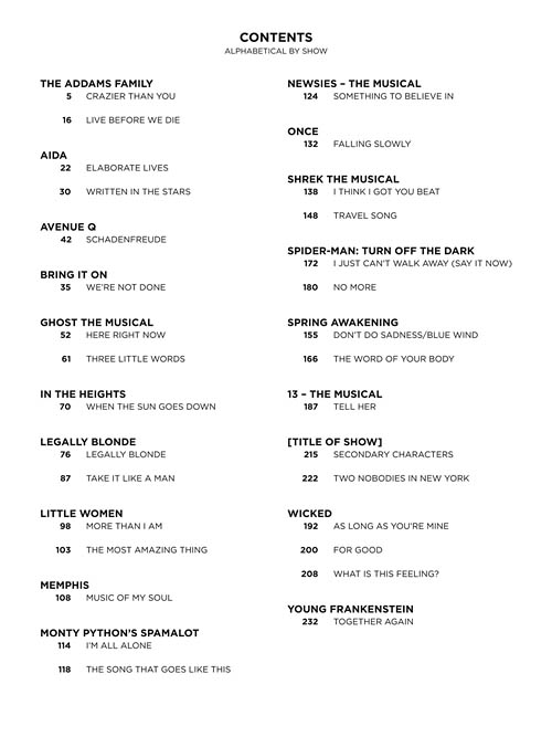 Duetos de várias combinações de vozes de grandes musicais - The Addams Family • Aida • Avenue Q • Bring It On • Ghost the Musical • In the Heights • Legally Blonde • The Lion King • Little Women • Memphis •ŸMonty Python's Spamalot • Newsies the Musical •ŸOnce • Shrek the Musical • Spider Man: Turn Off the Dark • Spring Awakening • 13: The Musical • [title of show] • Young Frankenstein.