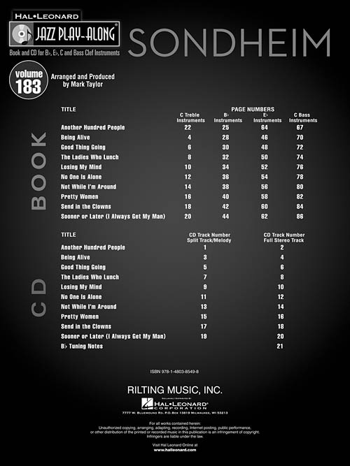 Esta série é uma excelente ferramenta de estudo para todos os músicos de Jazz. Todos os temas transcritos (melodia e acordes) para instrumentos em Bb, Eb, C e clave de fá. No CD cada tema tem duas gravações; uma faixa completa com a melodia e uma segunda faixa com o mesmo tema, porém sem a melodia, somente o play-back para que você possa tocar junto. Você ainda pode eliminar o Baixo ou o Piano usando o "balanço" do seu equipamento de som. "Chorus" adicionais para improvisação; incluindo: Another Hundred People • Being Alive • Good Thing Going • The Ladies Who Lunch • Losing My Mind • No One Is Alone – Part I • Not While I'm Around • Pretty Women • Send in the Clowns • Sooner or Later (I Always Get My Man).