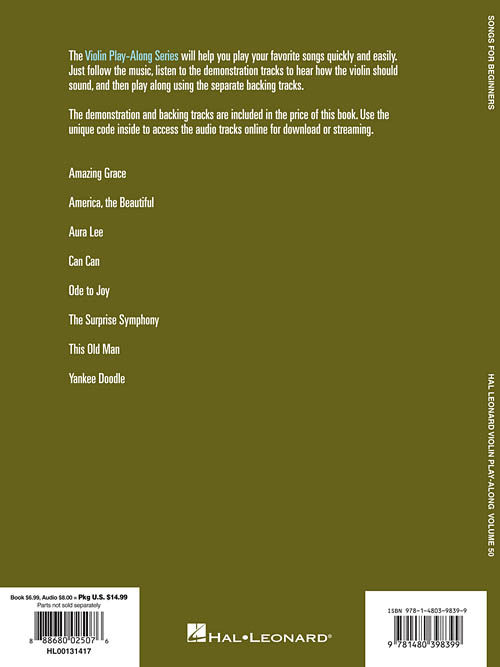 The Violin Play-Along series will help you play your favorite songs quickly and easily. Just follow the printed music, download or stream the online audio to hear how the violin should sound, and then play along using the separate backing tracks. With the melody and lyrics included in the book, you may also choose to sing along. Chord symbols are provided should you wish to elaborate on the melody.