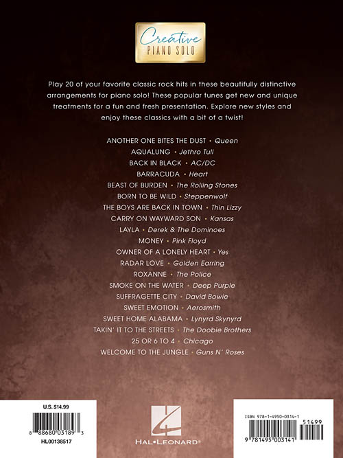 Play 20 of your favorite rock clasics in these beautifully distinctive arrangements for piano solo! These popular tunes get new and unique treatments for a fun and fresh presentation. Explore new styles and enjoy these favorites with a bit of a twist! 20 songs.