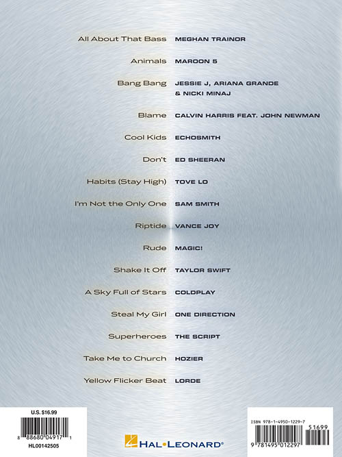 Transcrições para piano / voz e acordes para violão. All About That Bass (Meghan Trainor) • Animals (Maroon 5) • Don't (Ed Sheeran) • I'm Not the Only One (Sam Smith) • Rude (Magic!) • Shake It Off (Taylor Swift) • A Sky Full of Stars (Coldplay) • Take Me to Church (Hozier) • Yellow Flicker Beat (Lorde) • e outras!!!