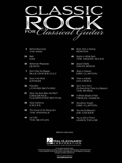 20 unique solo guitar arrangements of rock classics in standard notation and tablature.