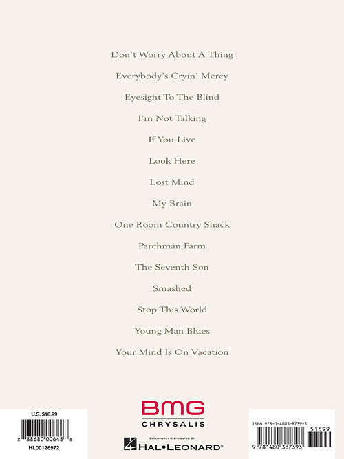 Arranjos para piano/voz. Don't Worry About a Thing • Everybody's Cryin' Mercy • Eyesight to the Blind • I'm Not Talking • If You Live • Look Here • Lost Mind • My Brain • One Room Country Shack • Parchman Farm • The Seventh Son • Smashed • Stop This World • Young Man Blues • Your Mind Is on Vacation.