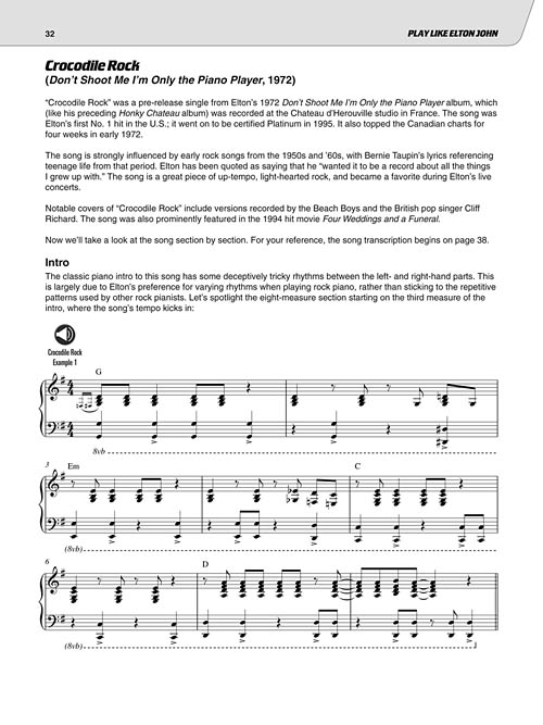 Study the trademark songs and signature phrases of the Rocket Man himself! This comprehensive book and audio teaching method provides detailed analysis of Elton John's grand pianos, techniques, styles, licks and much more. You'll learn everything you need to know about Elton's legnendary piano playing and find lists of recommended recordings and DVDs. It includes excerpts from 10 songs, plus five full songs: Don't Let the Sun Go Down on Me • Rocket Man • Crocodile Rock • Your Song • Sorry Seems to Be the Hardest Word.