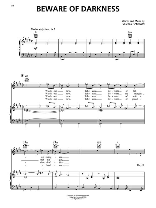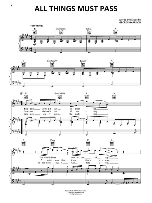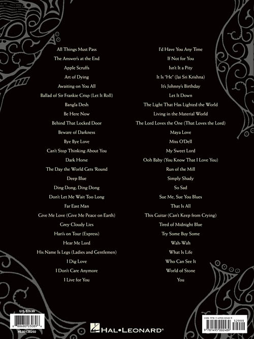 Transcrições para piano / voz e acordes para violão. All Things Must Pass • The Answer's at the End • Art of Dying • Ballad of Sir Frankie Crisp (Let It Roll) • Bangla Desh • Be Here Now • Bye Bye Love • Dark Horse • Don't Let Me Wait Too Long • Give Me Love (Give Me Peace on Earth) • Hear Me Lord • I Don't Care Anymore • Living in the Material World • My Sweet Lord • Ooh Baby (You Know That I Love You) • Sue Me, Sue You Blues • That Is All • This Guitar (Can't Keep from Crying) • You • e outras!!!