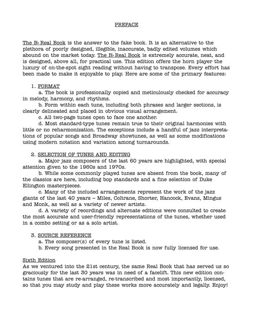 Os livros da série THE REAL BOOK são os livros de jazz mais vendidos de todos os tempos. Desde os anos 1970, os músicos tem confiado nessas transcrições para suas gigs e shows, noite após noite. Incluindo: All Blues • Au Privave • Autumn Leaves • Black Orpheus • Bluesette • Body and Soul • Bright Size Life • Con Alma • Dolphin Dance • Don't Get Around Much Anymore • Easy Living • Epistrophy • Falling in Love with Love • Footprints • Four on Six • Giant Steps • Have You Met Miss Jones? • How High the Moon • I'll Remember April • Impressions • Lullaby of Birdland • Misty • My Funny Valentine • Oleo • Red Clay • Satin Doll • Sidewinder • Stella by Starlight • Take Five • There Is No Greater Love • Wave • e muitas outras!!!