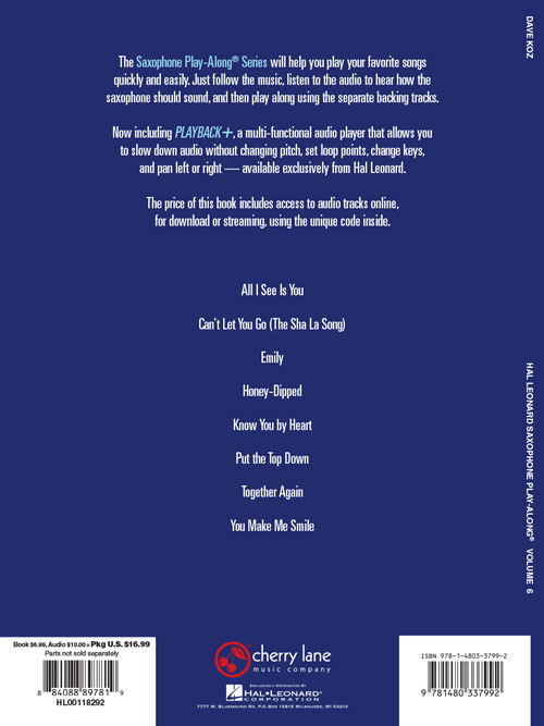 A série Saxophone Play-Along (para alto e tenor) vai ajudá-lo a tocar suas músicas de forma rápida e fácil. Basta seguir a partitura, ouvir a música para sentir como soa o som do saxophone e depois tocar junto utilizando a faixa de play-back. Áudio Online disponível para download ou streaming. All I See Is You • Can't Let You Go (The Sha La Song) • Emily • Honey-Dipped • Know You by Heart • Put the Top Down • Together Again • You Make Me Smile.