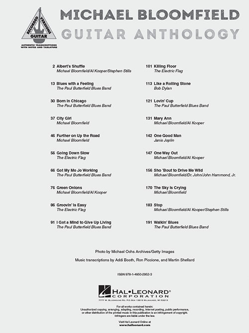 Michael Bloomfield is a legend of electric blues guitar. His unique playing style, combining blues and modal sclaes with expressive touch and phrasing, along with his signature, searing tone, has made him a key influential figure among legions of guitar players. This collection of songs contains highlights from the span of his career – including some of his acclaimed recordings with Bob Dylan, Janis Joplin, and the Paul Butterfield Blues Band – meticulously transcribed note-for-note in standard notation and tab. Now you can play the licks and solos that made Bloomfield famous! This collection contains 20 songs, including.