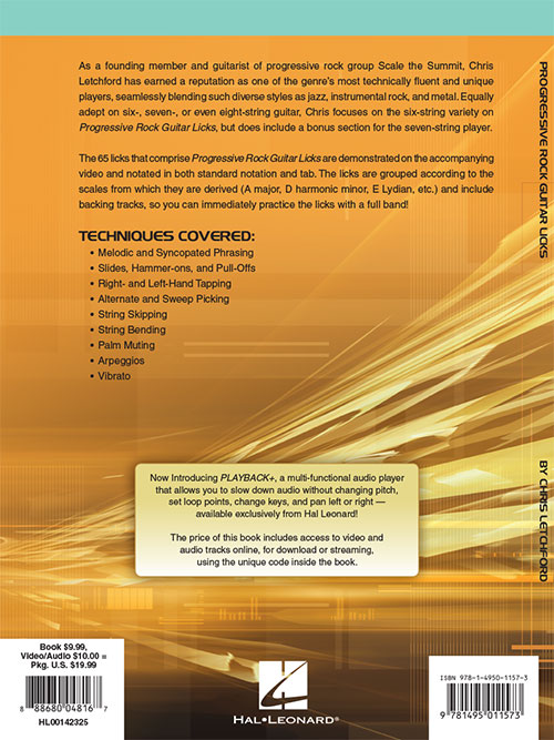 As a founding member and guitarist of progressive rock group Scale the Summit, Chris Letchford has earned a reputation as one of the genre's most technically fluent and unique players, seamlessly blending such diverse styles as jazz, instrumental rock, and metal. Equally adept on six-, seven-, or even eight-string guitar, Chris focuses on the six-string variety in Progressive Rock Guitar Licks, but includes a bonus section for the seven-string player. The 65 licks that comprise Progressive Rock Guitar Licks are demonstrated on the accompanying video and notated in both standard notation and tab. The licks are grouped according to the scales from which they are derived (A major, D harmonic minor, E Lydian, etc.) and include backing tracks, so you can immediately practice the licks with a full band! Techniques covered include: melodic and syncopated phrasing; slides, hammer-ons, and pull-offs; right- and left-hand tapping; alternate and sweep picking; string skipping; string bending; palm muting; arpeggios; vibrato; and more! The price of this book includes access to video and audio tracks online, for download or streaming, using the unique code inside the book!