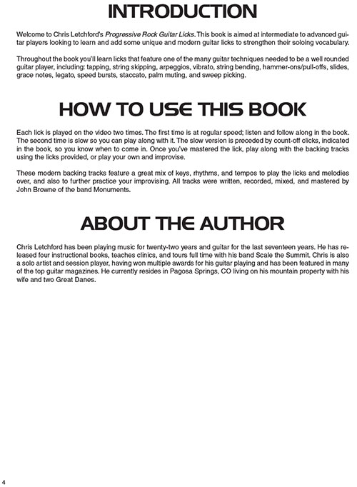 Como membro fundador e guitarrista do grupo de Rock Progressivo Scale The Summit, Chris Letchford ganhou reputação como um dos músicos mais técnicos e fluentes do gênero, mistura perfeitamente estilos tão diversos como jazz, rock instrumental e metal. Igualmente hábil na guitarra de seis, sete ou mesmo oito cordas, Chris centra-se na variedade de seis cordas em Progressive Rock Guitar Licks, mas inclui uma seção de bônus para o músico de sete cordas. Os 65 licks que compõem Progressive Rock Guitar Licks são demonstrados no vídeo de acompanhamento e são escritos na partitura e tablatura. Os licks são agrupados de acordo com as escalas dos quais são derivados (A maior, menor harmônica D, E Lydian, etc.) e incluem áudio de apoio, para que possa praticar imediatamente os licks com uma banda completa! Técnicas abordados incluem: fraseado melódico e sincopado; slides, hammer-ons e pull-offs; tapping; palhetada alternada e sweep; salto de corda; bends; palm muting; arpejos; vibrato; e mais! O preço deste livro inclui acesso a faixas de áudio e vídeo on-line, para download ou streaming, usando o código único dentro do livro!