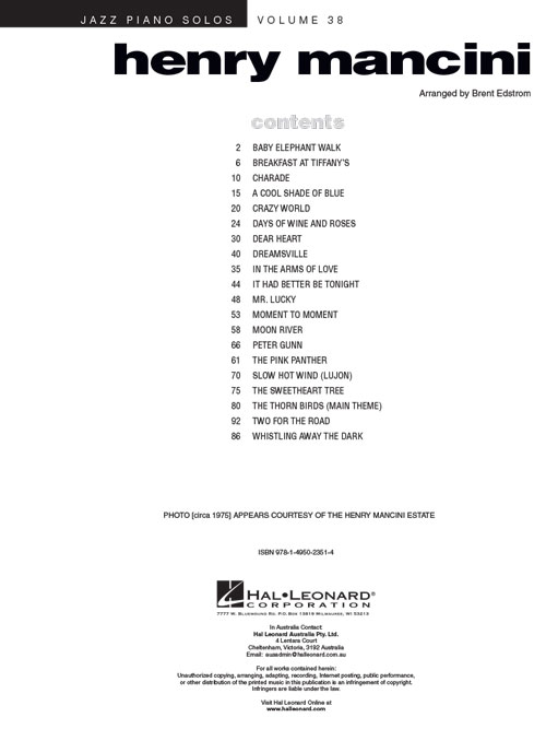 Transcrições para piano solo. Baby Elephant Walk • Breakfast at Tiffany's • Charade • Days of Wine and Roses • In the Arms of Love • Mr. Lucky • Moment to Moment • Moon River • Peter Gunn • The Pink Panther • The Thorn Birds (Main Theme) • Two for the Road • e outras!!!
