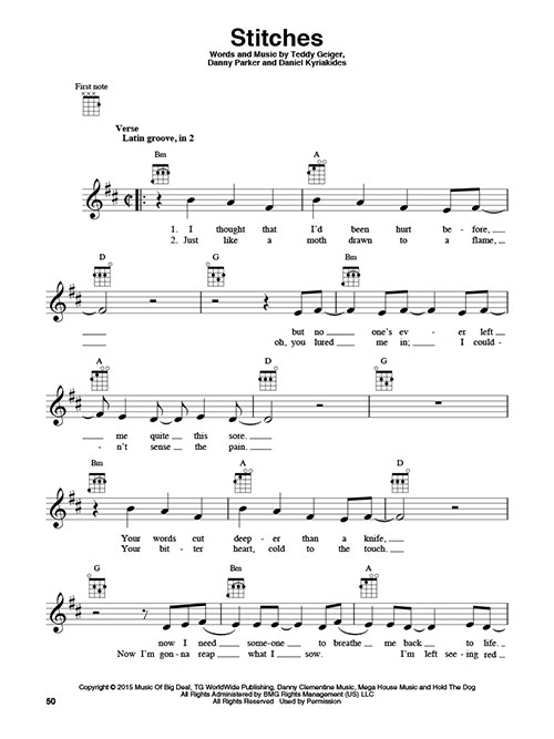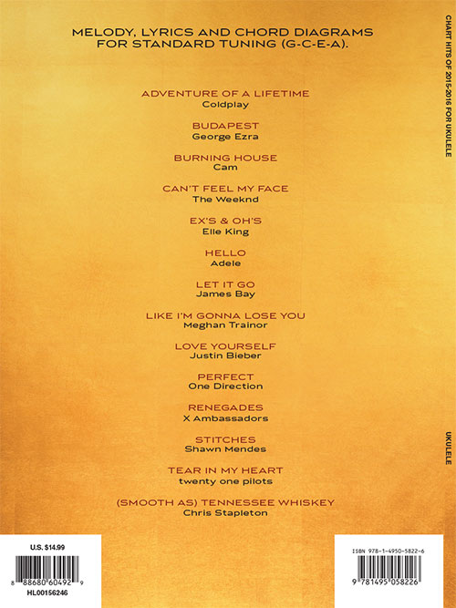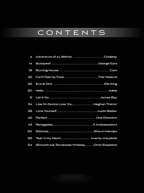 14 sucessos atuais arranjados para Ukulele (G-C-E-A). Melodia, letras e diagrama de acordes. Adventure of a Lifetime • Burning House • Can't Feel My Face • Ex's & Oh's • Hello • Like I'm Gonna Lose You • Perfect • Renegades • Stitches • (Smooth As) Tennessee Whiskey • e outros.