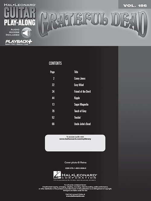 A série Guitar Play-Along vai ajudá-lo a tocar as suas canções favoritas de forma rápida e fácil. Basta seguir a partitura ou a tablatura, ouvir o áudio para sentir como soa o som da guitarra e depois tocar junto utilizando a faixa de play-back. As faixas de áudio estão disponíveis online, juntamente com um player digital (Playback+) que permite alterar o andamento sem alterar o tom, escolher trechos específicos para tocar, além de balanço direita/esquerda. A melodia e a letra também estão escritas caso você queira cantar. Casey Jones • Easy Wind • Friend of the Devil • Ripple • Sugar Magnolia • Touch of Grey • Truckin' • Uncle John's Band.
