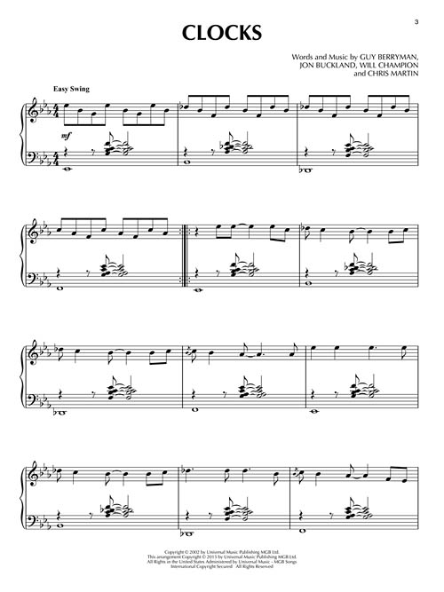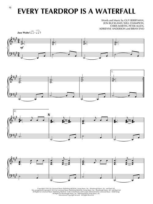 Transcrições de nível intermediário para piano solo. Clocks • Don't Panic • Every Teardrop Is a Waterfall • Fix You • Magic • Paradise • The Scientist • A Sky Full of Stars • Speed of Sound • Trouble • Viva La Vida • Yellow.