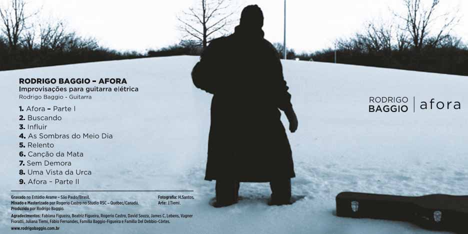 Produzido no Brasil e no Canadá e lançado nos Estados Unidos, ‘Afora’ é o primeiro disco solo do guitarrista brasileiro Rodrigo Baggio. Contendo apenas composições autorais, o repertório do CD é fruto do projeto ‘Guitarra Solo’, no qual o músico explora, em formato solo, elementos da Música Brasileira, do Jazz Europeu e da Música Clássica Contemporânea através da Improvisação.