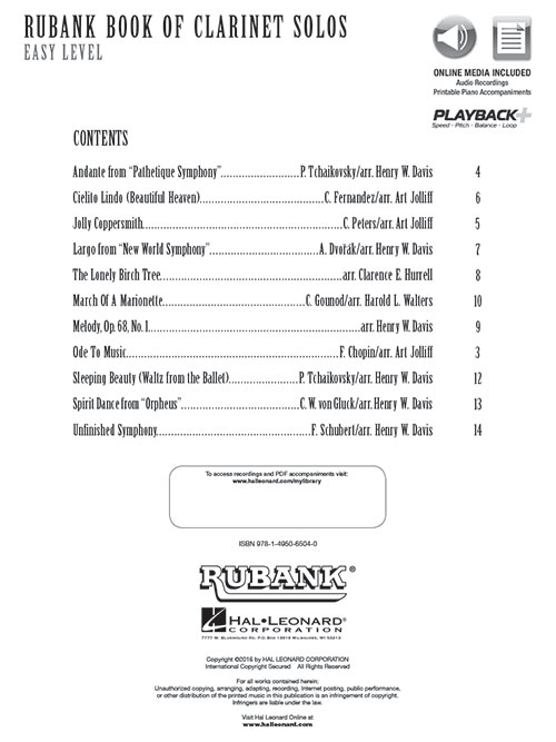 Esta compilação inclui 10 solos da lendária biblioteca educacional Rubank com arquivos de audio disponíveis online. As faixas de áudio estão disponíveis online para download ou streaming, juntamente com um player digital multifuncional (Playback+), que permite alterar o andamento sem alterar o tom, definir pontos específicos para tocar (loop), alterar o tom, além de balanço direita/esquerda. Andante from Pathetique Symphony (Tchaikovsky) · Cielito Lindo (Beautiful Heaven) · Funeral March of a Marionette (Gounod) · Jolly Coppersmith · Largo from New World Symphony (Dvorak) · The Lonely Birch Tree · Melody, Op 68 No. 1 (Schumann) · Ode to Music (Chopin) · Sleeping Beauty Waltz (Tchaikovsky) · Spirit Dance from Orpheus (Gluck) · Theme from Unfinished Symphony (Schubert)