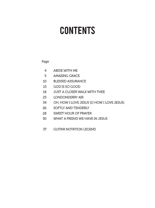 Arranjos para Guitarra; incluindo: Abide with Me · Amazing Grace · Blessed Assurance · God Is So Good · Just a Closer Walk with Thee · Londonderry Air · Oh How I Love Jesus · Softly and Tenderly · Sweet Hour of Prayer · What a Friend We Have in Jesus.
