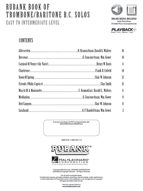 Esta compilação inclui solos da lendária biblioteca educacional Rubank com arquivos de audio disponíveis online. As faixas de áudio estão disponíveis online para download ou streaming, juntamente com um player digital multifuncional (Playback+), que permite alterar o andamento sem alterar o tom, definir pontos específicos para tocar (loop), alterar o tom, além de balanço direita/esquerda. Allerseelen, Op. 10 No. 8 (R. Strauss) · Berceuse (Concone) · Carnival of Venice (Davis) · Chartreuse (Cofield) · Dawn of Spring (Johnson) · Friends (Waltz Caprice) (Smith) · Funeral March of a Marionette (Gounod) · Meditation (Concone) · Red Canyons (Johnson) · Saraband (Handel).