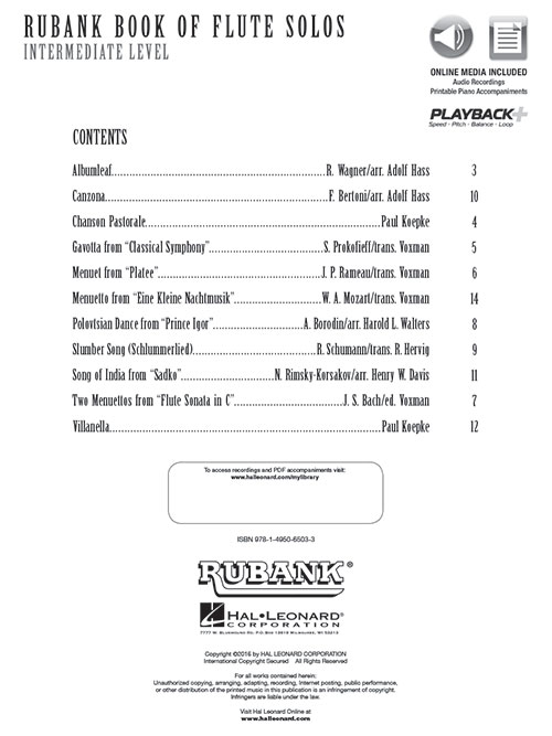 Esta compilação inclui solos da lendária biblioteca educacional Rubank com arquivos de audio disponíveis online. As faixas de áudio estão disponíveis online para download ou streaming, juntamente com um player digital multifuncional (Playback+), que permite alterar o andamento sem alterar o tom, definir pontos específicos para tocar (loop), alterar o tom, além de balanço direita/esquerda. Albumleaf (R. Wagner) · Canzona (Bertoni) · Chanson Pastorale (Koepke) · Gavotta from Classical Symphony · Menuet from Platee (Rameau) · Menuetto from Eine Kleine Nachtmusik (Mozart) · Polovtsian Dance (Borodin) · Slumber Song (Schlummerlied) (Schumann) · Song of India (Rimsky-Korsakov) · Two Menuettos from Flute Sonata in C (Bach) · Villanella (Koepke).