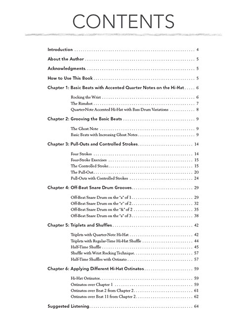 Being able to play a fast or complex rhythm is pointless if it doesn't have a good feel. Groove Studies will help intermediate players focus on applying the skills and concepts they have already learned in order to inject their drumming with life, character, and feel. The fun and useful exercises in this book contain studies in timing, motion, coordination, technique, and touch. Groove Studies includes: 73 audio tracks that include demos and full-band tracks that can be used as play-alongs • basic beats with accented hi-hat • use of rimshots and ghost notes • pull-outs and controlled strokes • triplets and shuffle rhythms • cymbal ostinatos • and more. The price of this book includes access to audio tracks online, for download or streaming, using the unique code inside the book. Now including PLAYBACK+, a multi-functional audio player that allows you to slow down audio without changing pitch, set loop points, and pan left or right.
