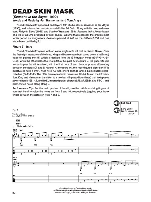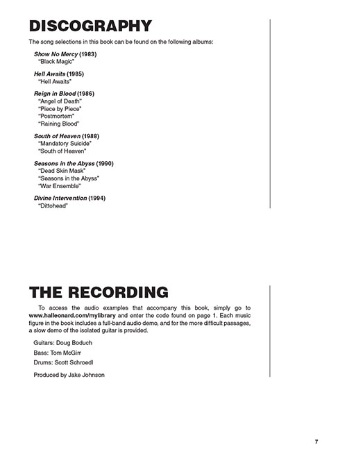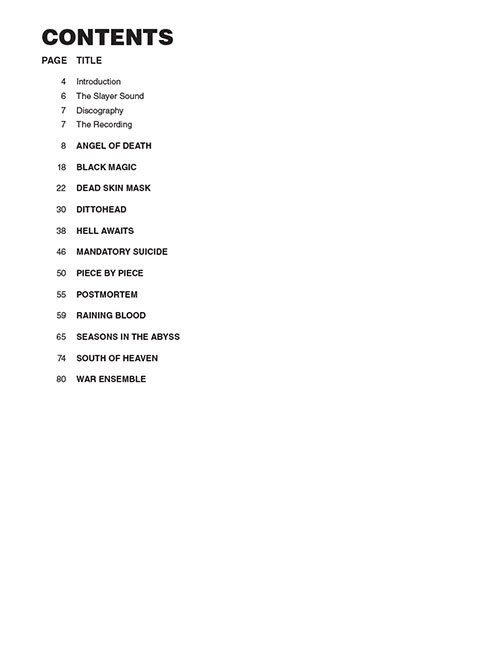 Learn the classic thrash metal riffs and solos of Slayer, as played by guitarists Jeff Hanneman and Kerry King. You get a step-by-step breakdown of the guitar styles and techniques used in songs including: Angel of Death • Black Magic • Dead Skin Mask • Dittohead • Hell Awaits • Mandatory Suicide • Piece by Piece • Postmortem • Raining Blood • Seasons in the Abyss • South of Heaven • War Ensemble. Includes online access to full band audio demos at normal and slow speeds for download or streaming.