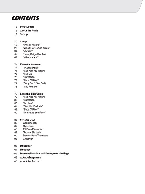 Study the trademark songs, grooves, solos, and techniques of the madman drum god, Keith Moon. This comprehensive book and audio teaching method provides detailed analysis of Moon the Loon's kit, style, songs, grooves, fills, solos, and much more. You'll learn everything you need to know about Moon's groundbreaking drumming. Each book also includes a unique code that gets you access to online audio samples of all the music in the book.