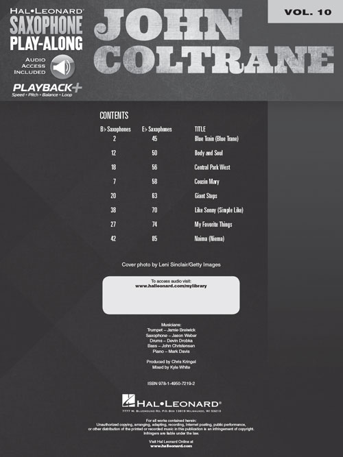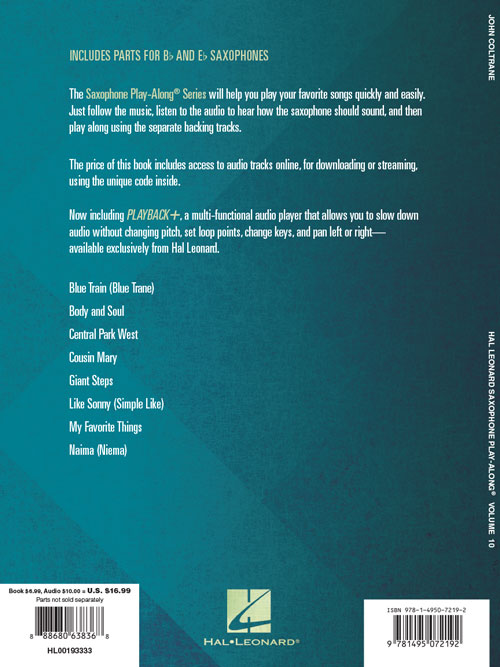 A série Saxophone Play-Along vai ajudá-lo a tocar suas músicas de forma rápida e fácil. Basta seguir a partitura, ouvir a música para sentir como soa o som do saxophone e depois tocar junto utilizando a faixa de play-back. Áudio Online disponível para download ou streaming.: Blue Train (Blue Trane) · Body and Soul · Central Park West · Cousin Mary · Giant Steps · Like Sonny (Simple Like) · My Favorite Things · Naima (Niema).