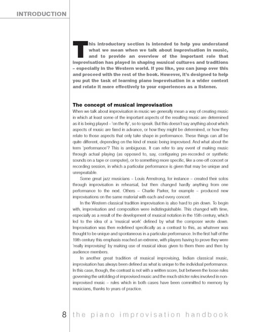 Piano Improvisation Handbook oferece uma visão abrangente das habilidades práticas e questões teóricas envolvidas no domínio de todas as formas de improvisação de piano, incluindo clássico, jazz, rock e blues. Considerando que a maioria dos livros oferece pouco mais do que modelos de imitação e exercícios para praticar, este adota uma abordagem especificamente destinada a incentivar e habilitar a exploração criativa independente. O livro contém uma série de seções de tutoriais graduados com exemplos musicais em CD, bem como um apêndice listando escalas úteis, acordes, voicings e progressões em todas as tonalidades, uma bibliografia e uma discografia. Além de seções que descrevem como a melodia, a harmonia, o ritmo, a textura e a forma funcionam na música de piano improvisada, dando ênfase distinta à interconectividade da improvisação clássica e jazzística, há seções dedicadas a explicar como as ideias podem ser desenvolvidas e explora o processo de encontrar um estilo pessoal.