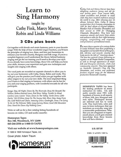 Now that these popular lessons are on CD, it's easier than ever to start harmonizing! Complete beginners will learn the theory behind harmony singing and get the ear training they need, while those with some knowledge will hone their skills and build repertoire. The vocal parts are recorded on separate channels for singing along with Cathy, Marcy, Robin and Linda. Songs: Stay All Night • Down by the Riverside • Bury Me Beneath the Willow • Broken-Hearted Lover • Red River Valley • Trouble in Mind • Careless Love • Leavin' Train • Down in the Valley • Turtle Dove • Little Darlin' Pal of Mine • Keep on the Sunny Side • Blues Stay Away from Me • Gold Watch and Chain • Amazing Grace • Goodnight, Irene • I'm Going to Sit at the Welcome Table • Long Journey Home • Good Old Mountain Dew • Hand Me Down My Walking Cane. THREE CDs • INCLUDES SONGBOOK • LEVEL 1