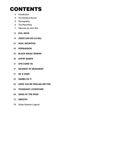 Explore a música por trás de um dos maiores inovadores da guitarra com uma análise prática de Wolf Marshall de 14 clássicos de Santana. Incluindo: Black Magic Woman • Evil Ways • Gypsy Queen • Hope You're Feeling Better • Oye Como Va • Persuasion • Smooth • Soul Sacrifice • e outras!!! As faixas de áudio estão disponíveis online, juntamente com um player digital multifuncional (Playback+), que permite alterar o andamento sem alterar o tom, definir pontos específicos para tocar (loop), alterar o tom, além de balanço direita/esquerda.