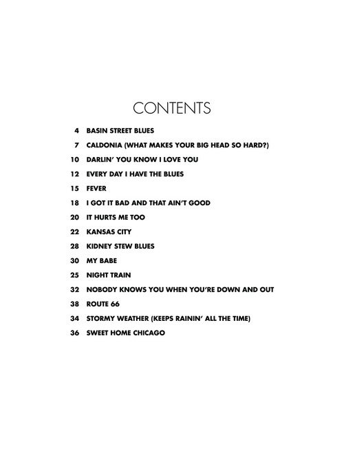 Arranjos para piano solo por Phillip Keveren de clássicos do Blues; incluindo: Basin Street Blues • Caldonia (What Makes Your Big Head So Hard?) • Darlin' You Know I Love You • Every Day I Have the Blues • Fever • I Got It Bad and That Ain't Good • It Hurts Me Too • Kansas City • Kidney Stew Blues • My Babe • Night Train • Nobody Knows You When You're Down and Out • Route 66 • Stormy Weather (Keeps Rainin' All the Time) • Sweet Home Chicago.