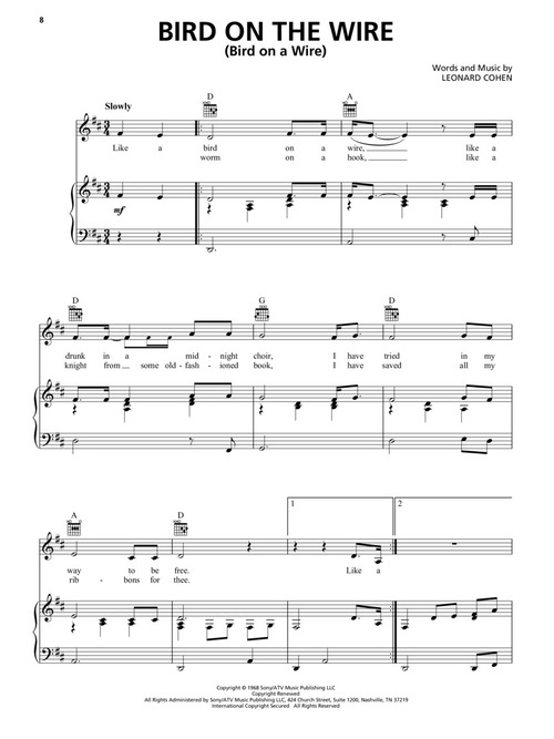 Transcrições para piano/voz e acordes para violão: Bird on the Wire (Bird on a Wire) • Chelsea Hotel #2 • Everybody Knows • Famous Blue Raincoat • The Future • I'm Your Man • Nevermind • Suzanne • Tower of Song • Waiting for the Miracle • You Want It Darker • Hallelujah • e outras!!!