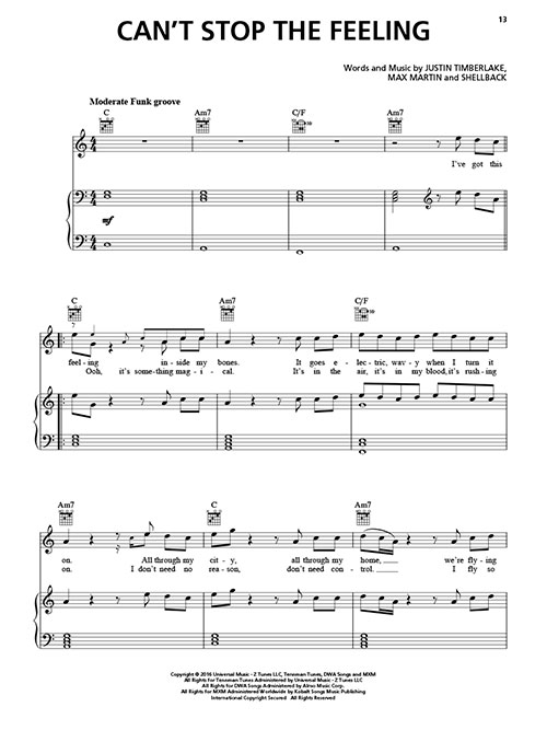 Transcrições para piano e acordes para violão. Timberlake; Anna Kendrick; Zooey Deschanel; Gwen Stefani; Ariana Grande; Earth, Wind & Fire; and more! It includes the Grammy® Award-winning song “Can't Stop the Feeling” plus: Get Back up Again • Hair Up • Hello • September • The Sound of Silence • They Don't Know • True Colors • e outras!!!