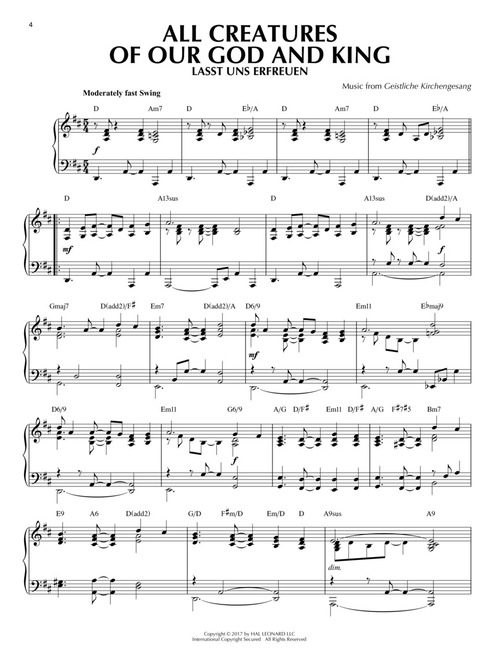 33 hymns reimagined for jazz piano in piano solo arrangements with chord symbols.