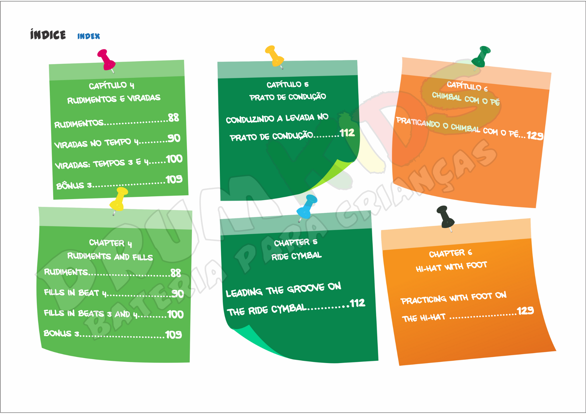 O professor de bateria, ou mesmo a mãe, o pai, ou quem quiser se aventurar, pode contar com um processo passo a passo que demonstra desde a postura (mãos, pés, costas), à identificação de cada peça da bateria e sua função. Incluído no material: uma atividade complementar (Colorir!) para deixar tudo mais dinâmico, além de um repertório sugerido de 20 músicas do universo pop/rock, combinado com as levadas estudadas e áudios (das levadas) disponíveis online gratuitamente.