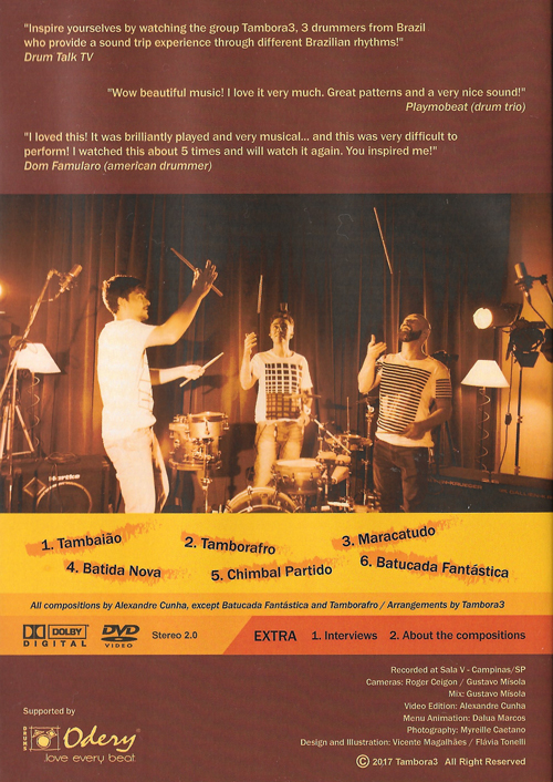 Tambora 3,lanca seu primeiro DVD! Um trio de bateristas surpreendente e inusitado, que explora os ritmos brasileiros com muita orquestração, sincronismo, dinamismo e virtuose,Liderado por Alexandre cunha baterista de renome internacional, o trio conta com os bateristas Guilherme Sanita e Ricardo Oliveira, Venha se surpreender com peças brasileiras e divertidas!