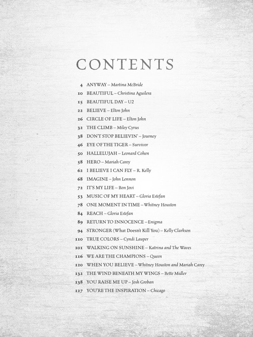 Transcrições para piano e acordes para violão; incluindo: Beautiful Day • Circle of Life • Don't Stop Believin' • Hero • One Moment in Time • Stronger (What Doesn't Kill You) • True Colors • Walking on Sunshine • The Wind Beneath My Wings • You Raise Me Up • e outras!!!