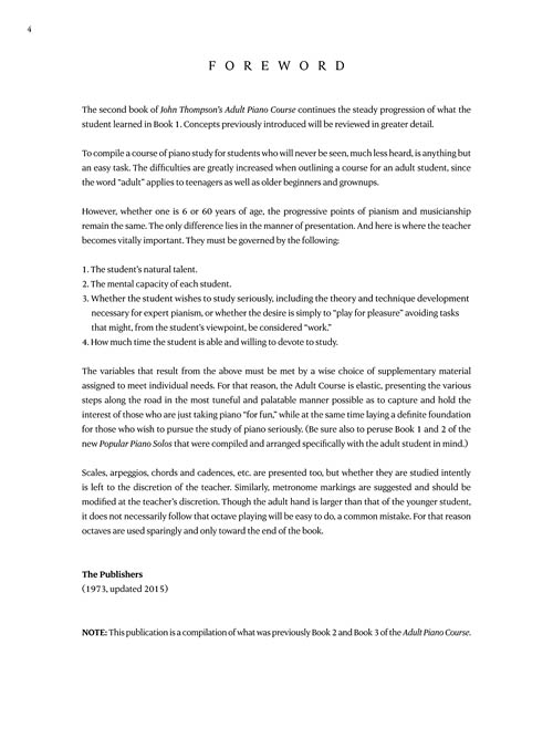Recentemente atualizado, o curso de piano adulto John Thompson foi compilado com o aluno adulto em mente. Os adultos têm a mesma estrada musical para viajar como o estudante mais novo, mas o material de estudo para um estudante adulto diferirá ligeiramente em conteúdo. Uma vez que esses livros foram escritos e dispostos especialmente para adultos, eles contêm uma mistura maravilhosa de arranjos clássicos, melodias populares e originais que muitos encontrarão o prazer de aprender e tocar. Mais importante ainda, o aluno sempre é encorajado a tocar artisticamente e com a maior compreensão musical possível.