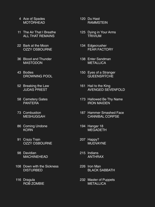 Transcrições para guitarra na partitura e tablatura de grandes nomes do Metal - Motorhead, Judas Priest, Pantera, Korn, Ozzy Osbourne, Rob Zombie, Disturbed e muitos outros; inlcuindo: Ace of Spades • Bark at the Moon • Breaking the Law • Crazy Train • Dying in Your Arms • Enter Sandman • Hail to the King • Iron Man • Master of Puppets • No More Tears • Painkiller • Redneck • Symphony of Destruction • Toxicity • War Pigs (Interpolating Luke's Wall) • Your Betrayal • e outras!!!