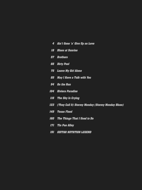Transcrições para guitarra na partitura e tablatura; incluindo: Ain't Gone 'n' Give up on Love • Blues at Sunrise • Brothers • Dirty Pool • Leave My Girl Alone • May I Have a Talk with You • On the Run • Riviera Paradise • The Sky Is Crying • (They Call It) Stormy Monday (Stormy Monday Blues) • Texas Flood • The Things That I Used to Do • Tin Pan Alley.