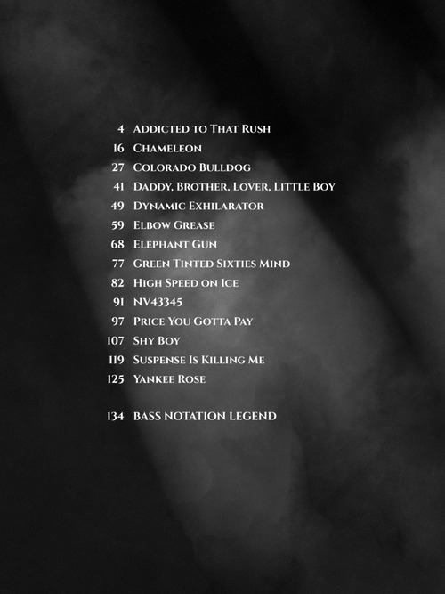 Transcrições para baixo na partitura e tablatura das linhas e solos de Billy Sheehan, incluindo: Sheehan's solo (“Chameleon” and 2 others) bem como as partes de baixo das bandas de rock Mr. Big (“Addicted to That Rush” and 4 more), Talas (“High Speed on Ice” and “NV43345”), and Niacin (“Elbow Grease”), plus David Lee Roth (“Yankee Rose” and 2 others).